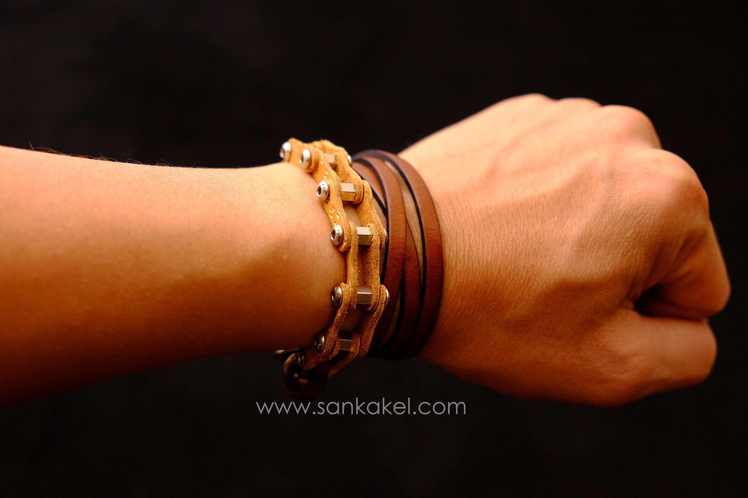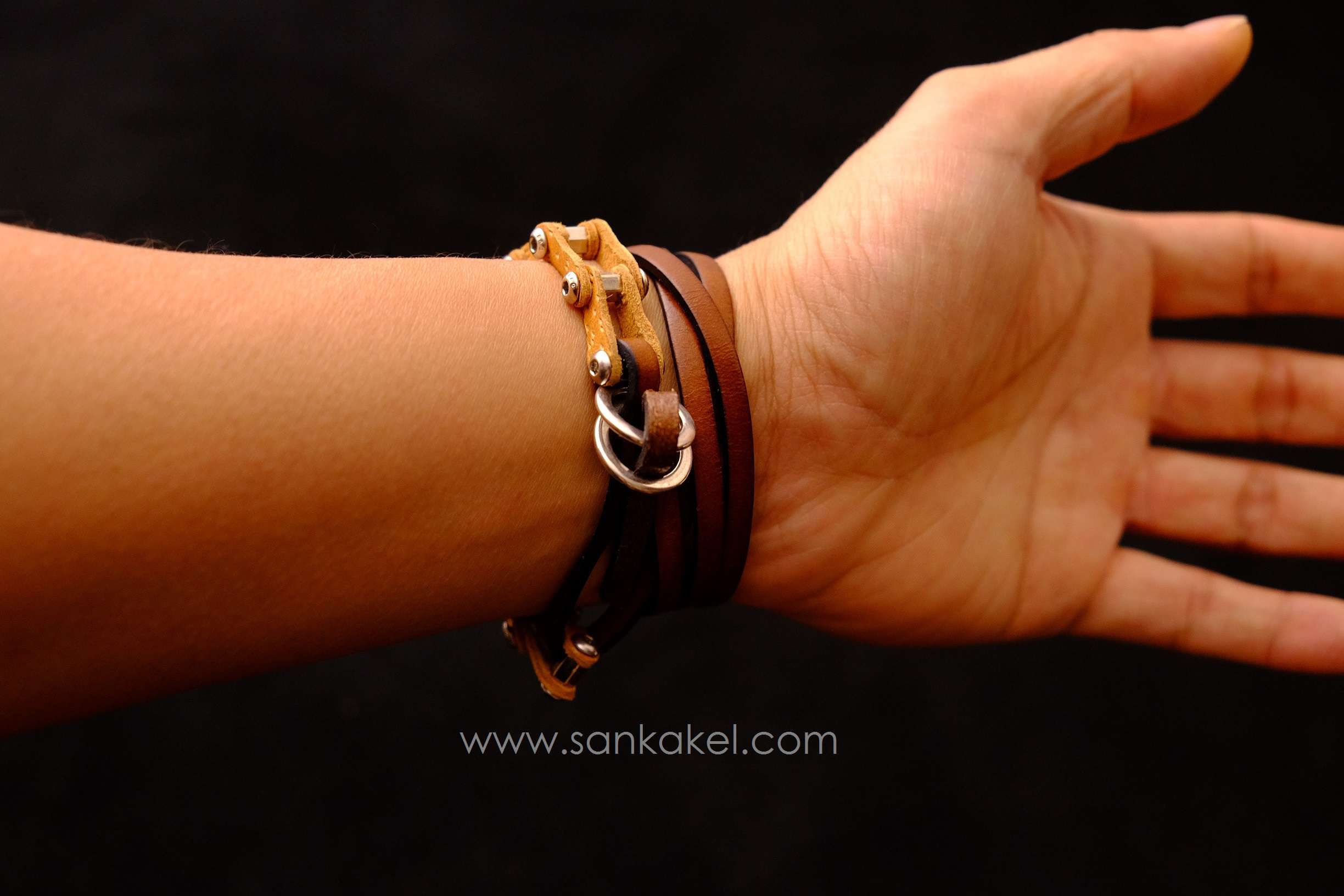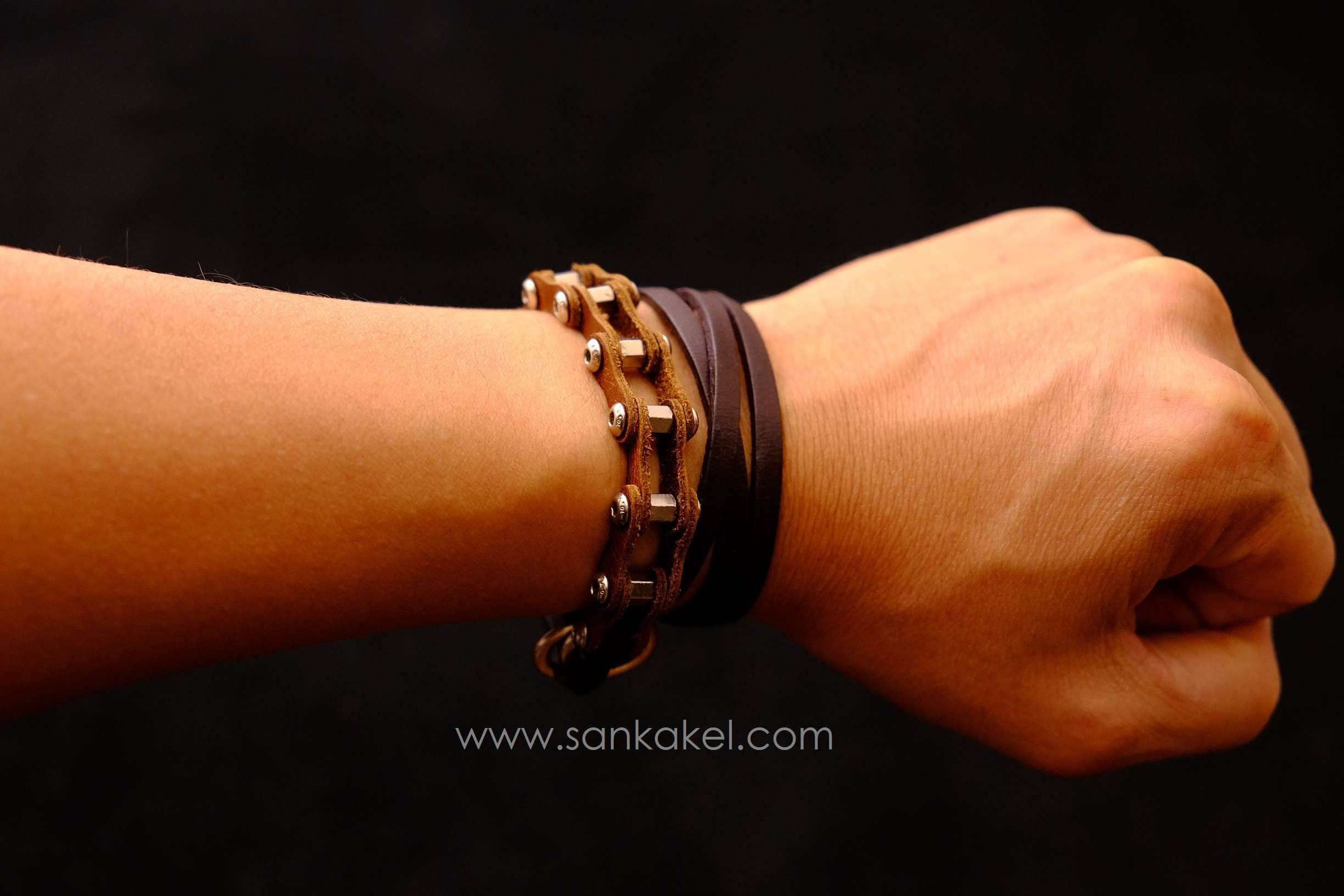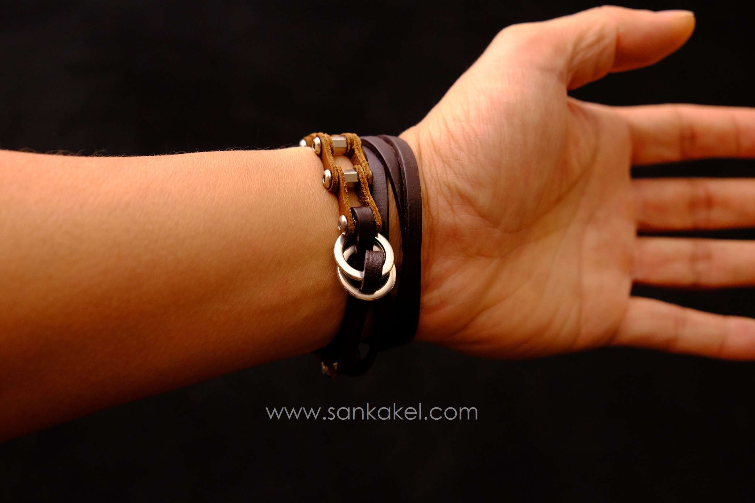 "Bike chain" part in brown leather and dark brown leather bands.
