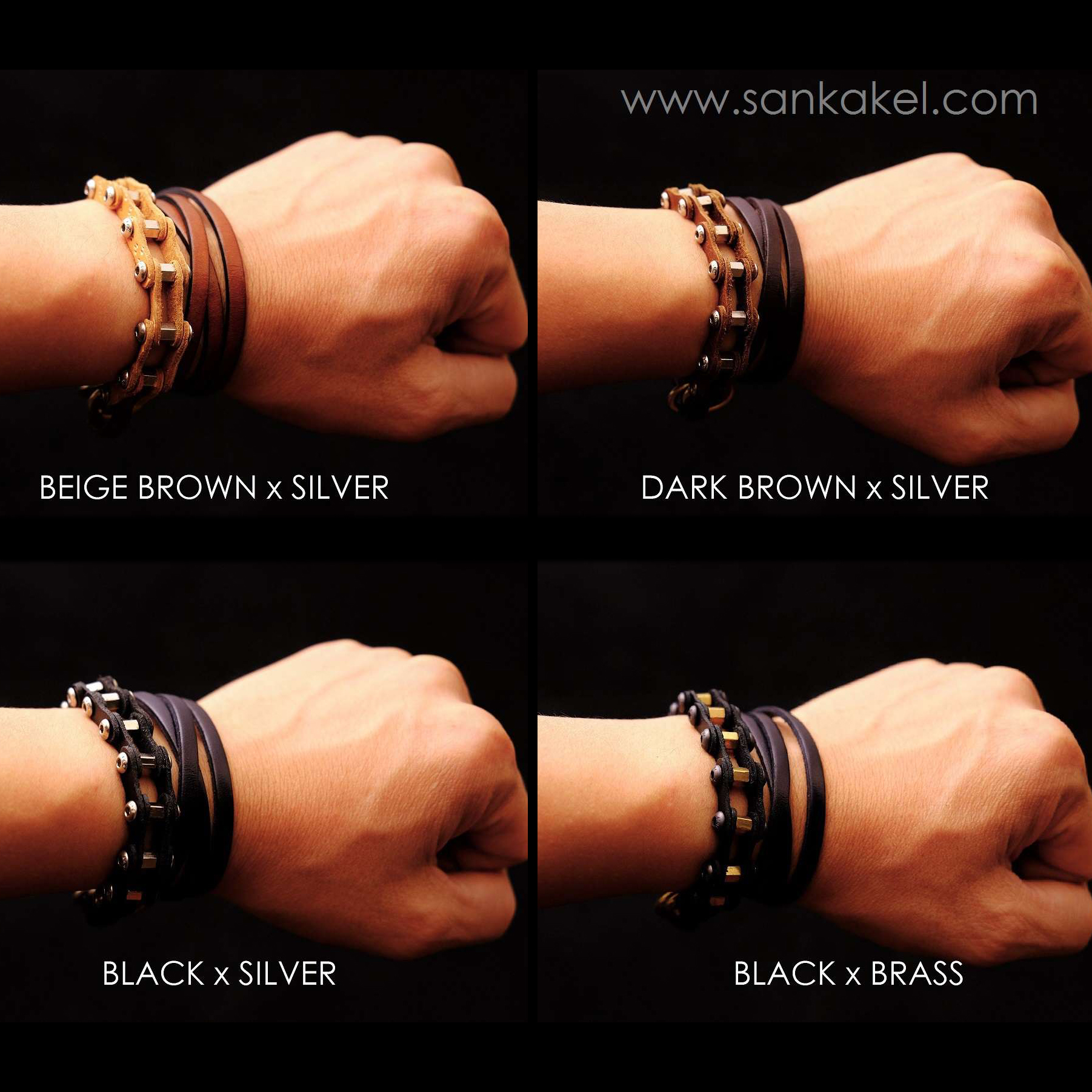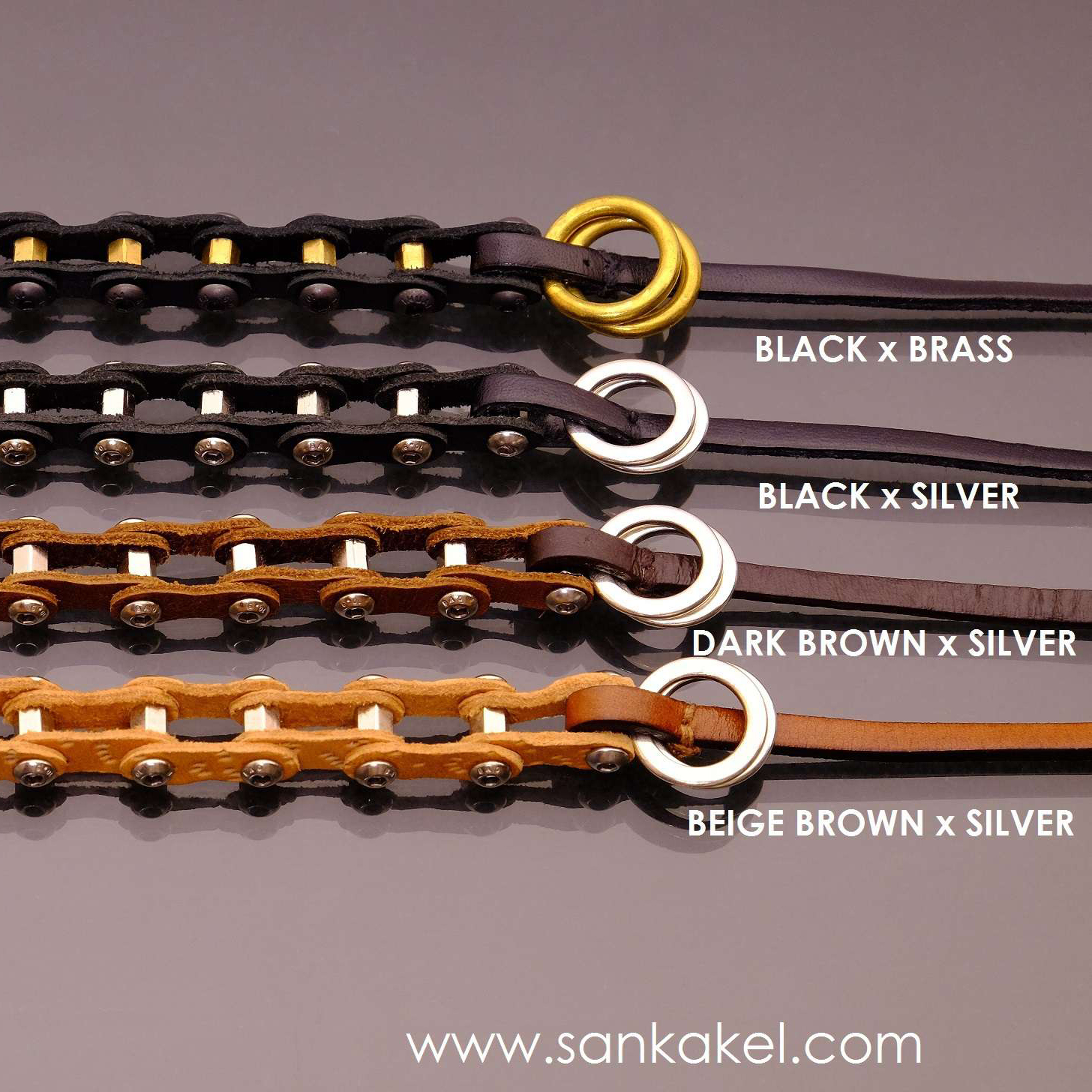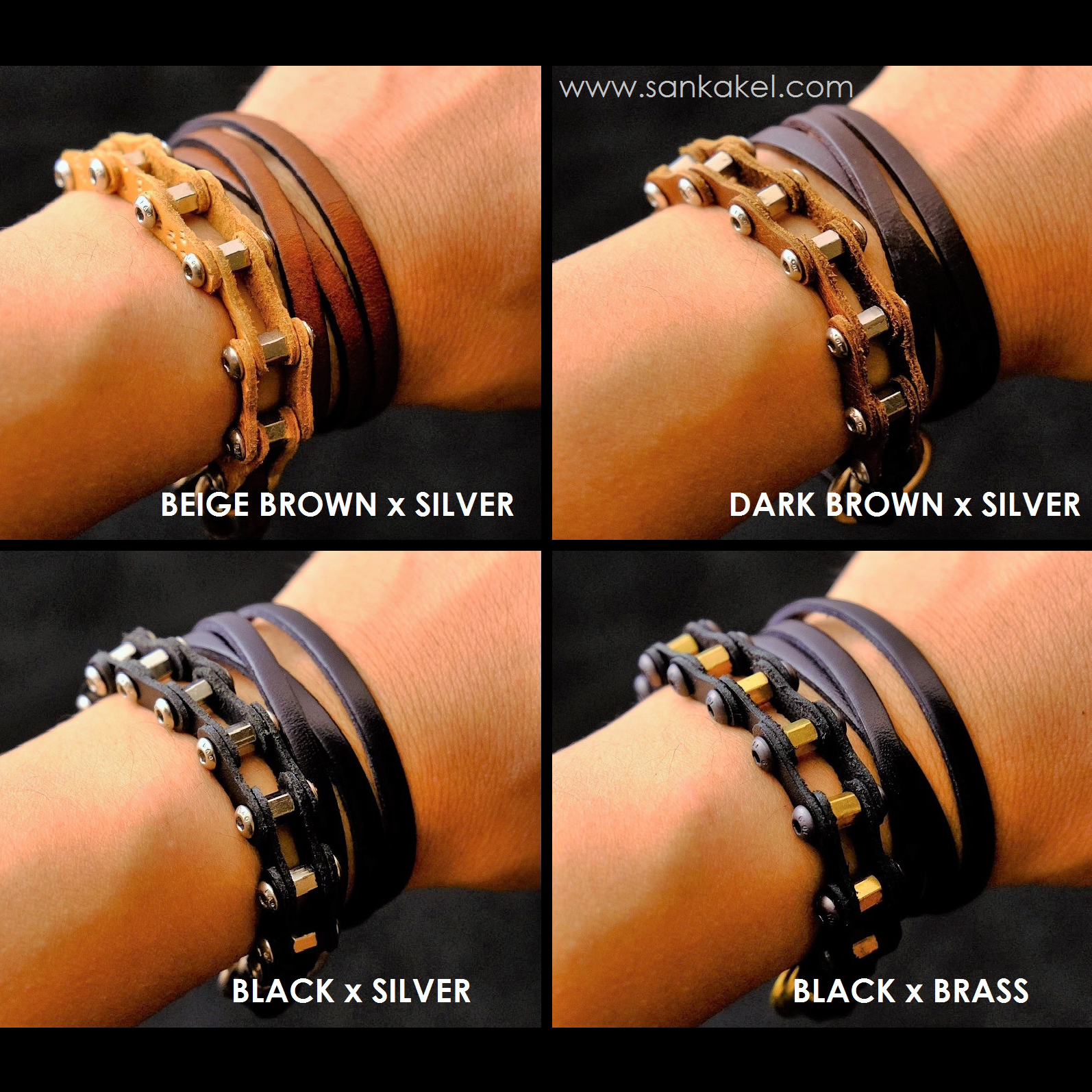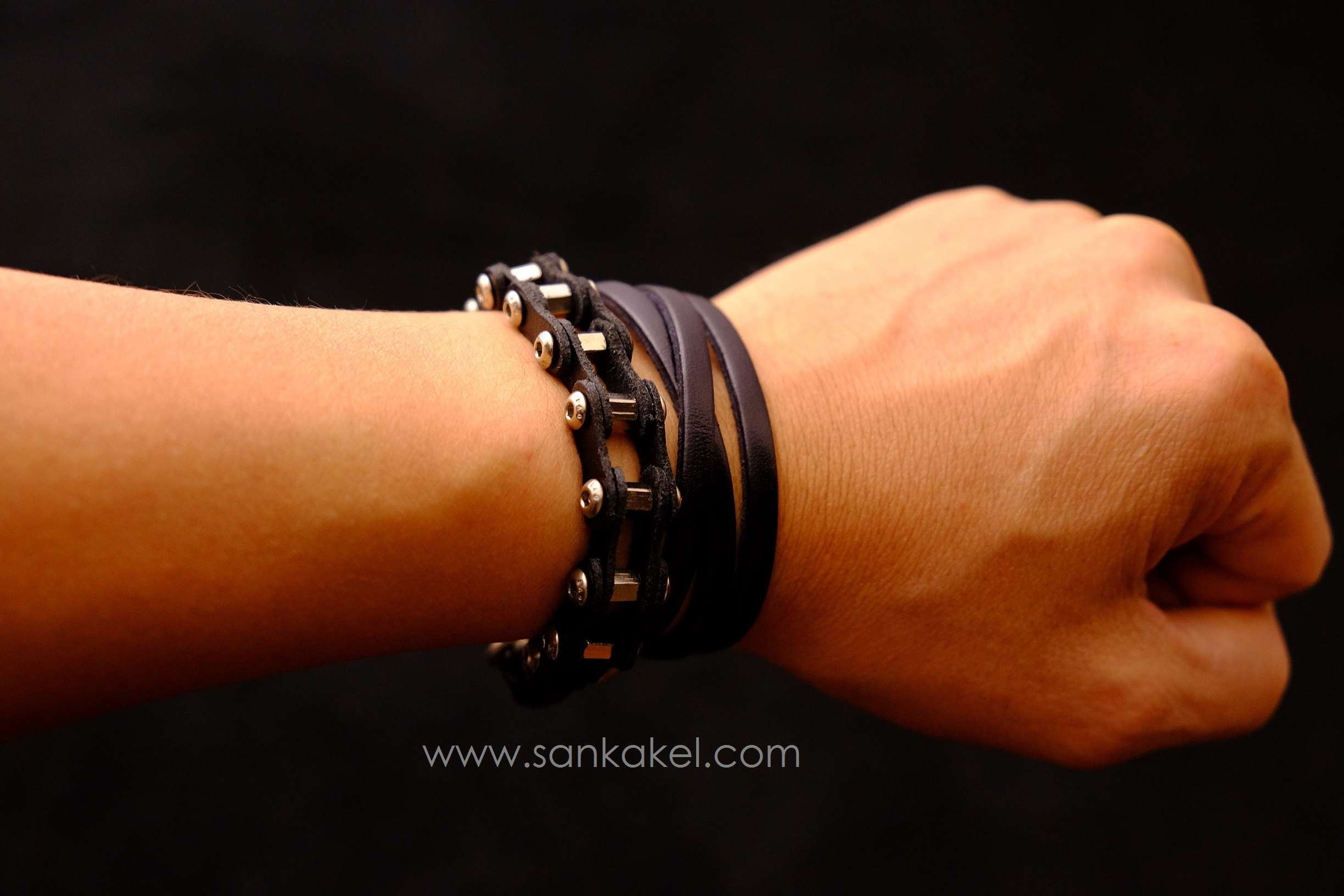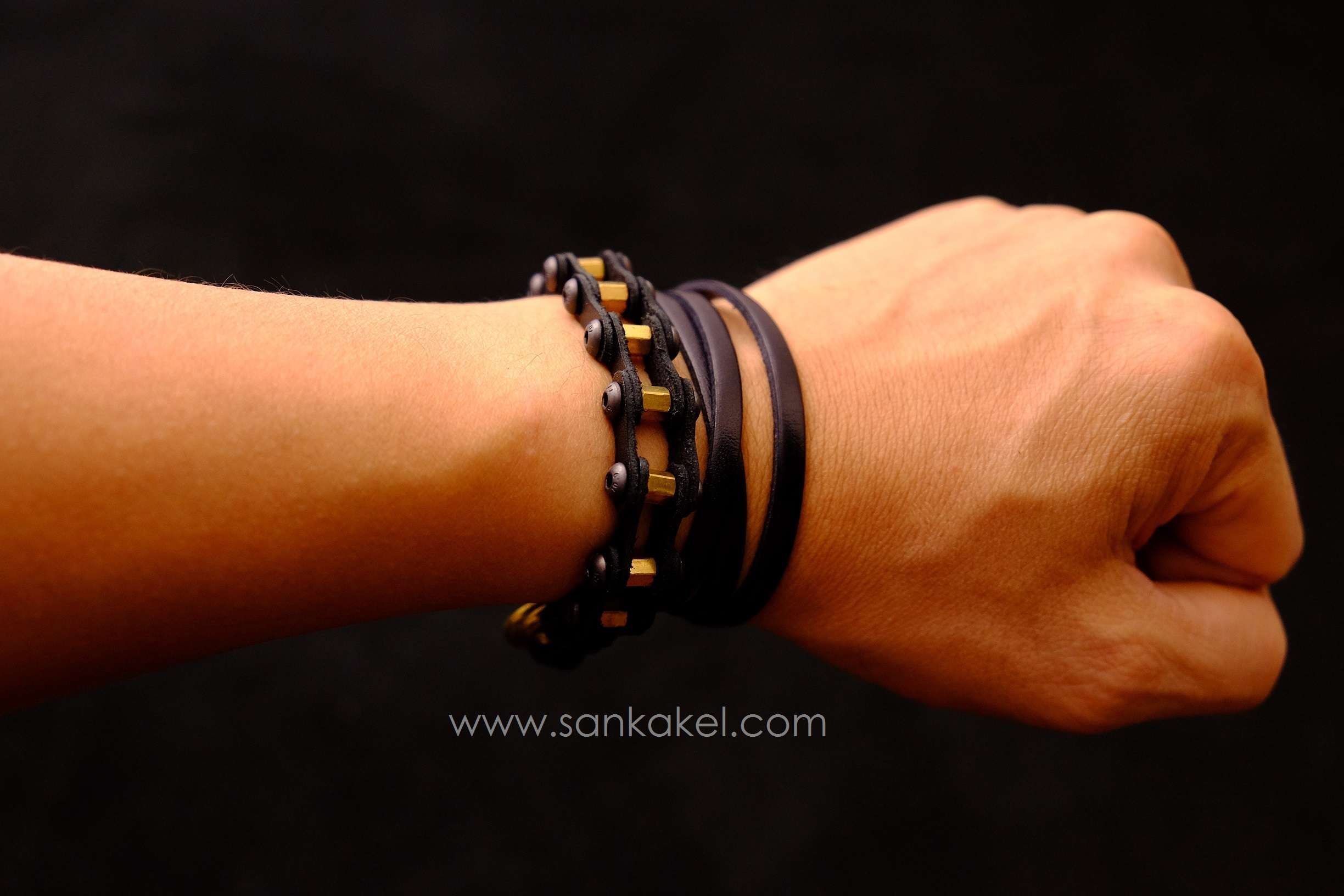 "Bike chain" part in brown leather and dark brown leather bands.