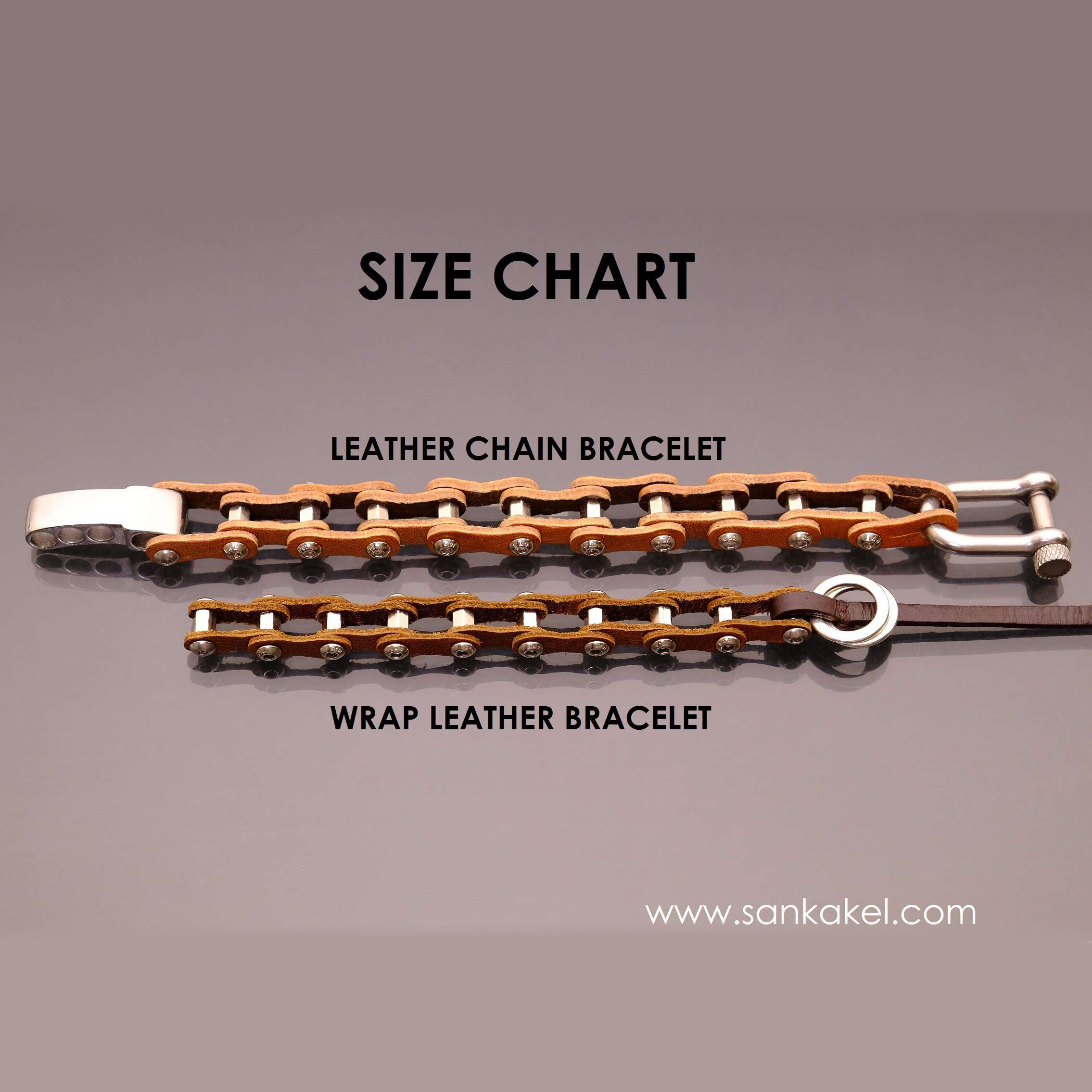 Links like the "leather chain bracelet" but thinner than the original bracelet and multiple leather straps. Easily adjustable to all wrist sizes (2 to 3 laps with leather bands, depending on your size).